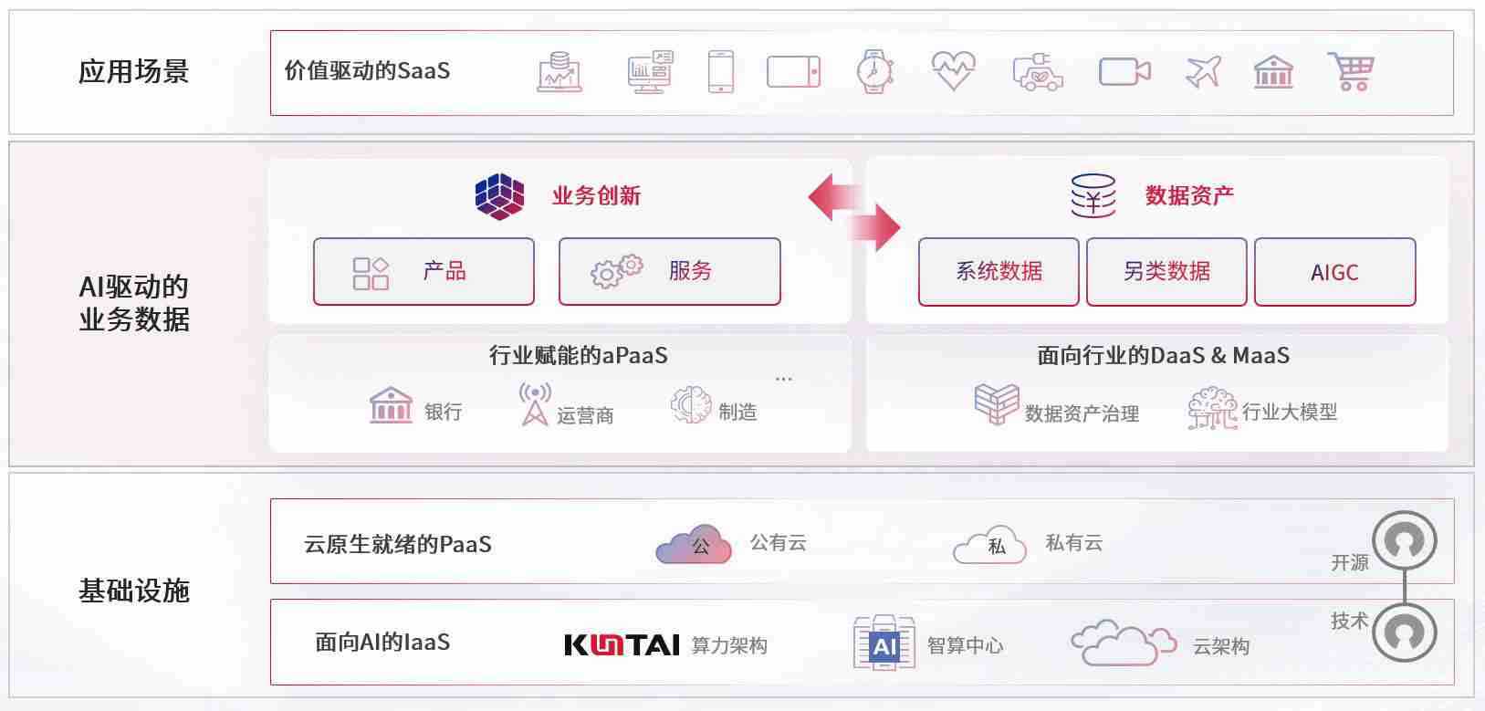 数字时代,,,,围绕企业数字化转型的关键要素,,Z6尊龙数码开创性的提出数云融合战略和技术体系框架,,,,着力在云原生、、、数字原生、、AI原生和信创产业上架构产品和服务能力,,,为处在不同数字化转型阶段的快消零售、、、、汽车、、金融、、、医疗、、、政企、、教育、、、、运营商等行业客户提供泛在的敏捷IT能力和融合的数据驱动能力,,,构建跨界融合创新的数字业务场景和新业务模式,,,助力企业级客户建立面向未来的核心能力和竞争优势,,,全面推动社会的数字化、、、智能化转型升级。。。